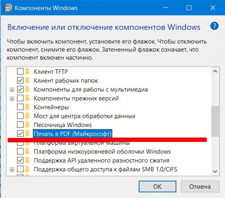 Обратите внимание, в ряде сборок для данной манипуляции может понадобиться активация виртуального принтера. Для этого переходим по пути Панель управления — Программы и компоненты и во вкладку Включение или отключение компонентов Windows. В открывшемся окне нужно отметить флажком пункт Печать в PDF (Майкрософт) и сохранить изменения.