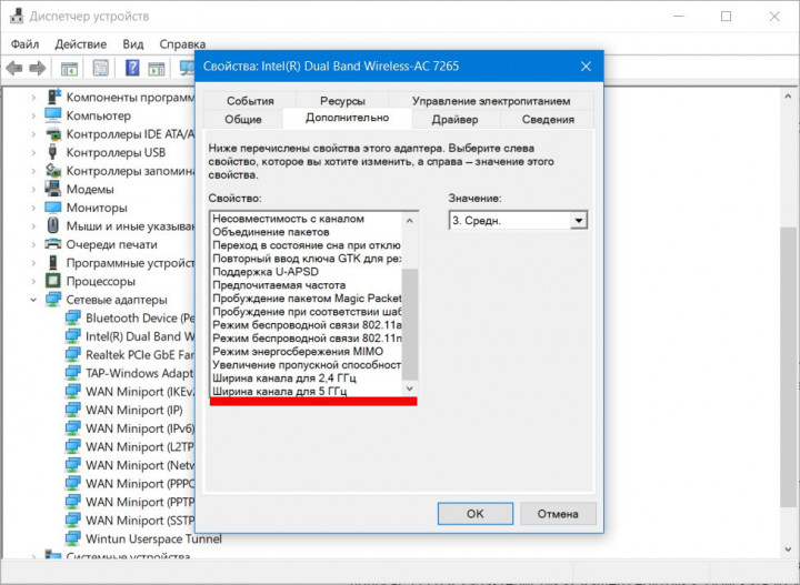Вызываем его сочетанием клавиш Win+R и вводим команду devmgmt.msc. В результате вы увидите Диспетчер устройств, где вам будет нужно раздел Сетевые адаптеры. Находим тот, в котором будет упомянут модуль Wi-Fi (Wireless). В зависимости от вашего производителя это название может отличаться. Кликаем по нему дважды и переходим во вкладку Дополнительно. Если на вашем ноутбуке есть поддержка 5 ГГц, вы найдете ее упоминание.