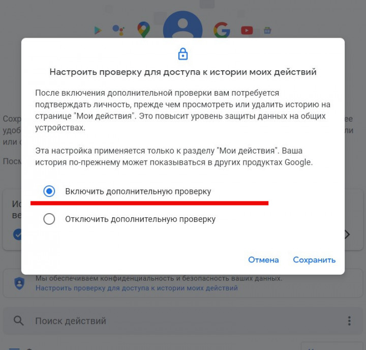 Первым делом, вам нужно будет подтвердить свою личность, если вы это не сделали ранее. На открывшейся странице находим ссылку “Настроить проверку для доступа к истории моих действий” и выбираем “Включить дополнительную проверку”. Далее вам нужно будет ввести пароль от своего аккаунта, чтобы подтвердить личность.
