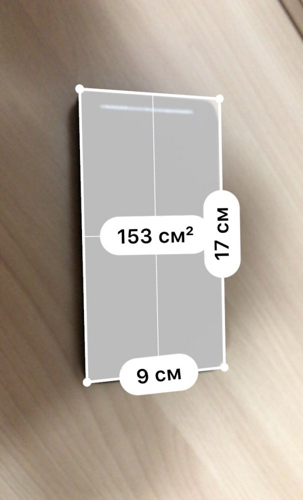 После запуска программы и выбора рулетки, пользователю остается направить камеру смартфона на исследуемый объект и немного повращать его. Используя видоискатель камеры, вы создаете виртуальные метки, с опорой на которые и будет производится расчет. После успешного измерения, вы можете нажать на “+” и перейти, например, к следующей грани. После этого программа сможет, если необходимо, самостоятельно рассчитать площадь интересующего нас объекта. Правая нижняя кнопка сохранит результаты измерений, левая — полный сброс.